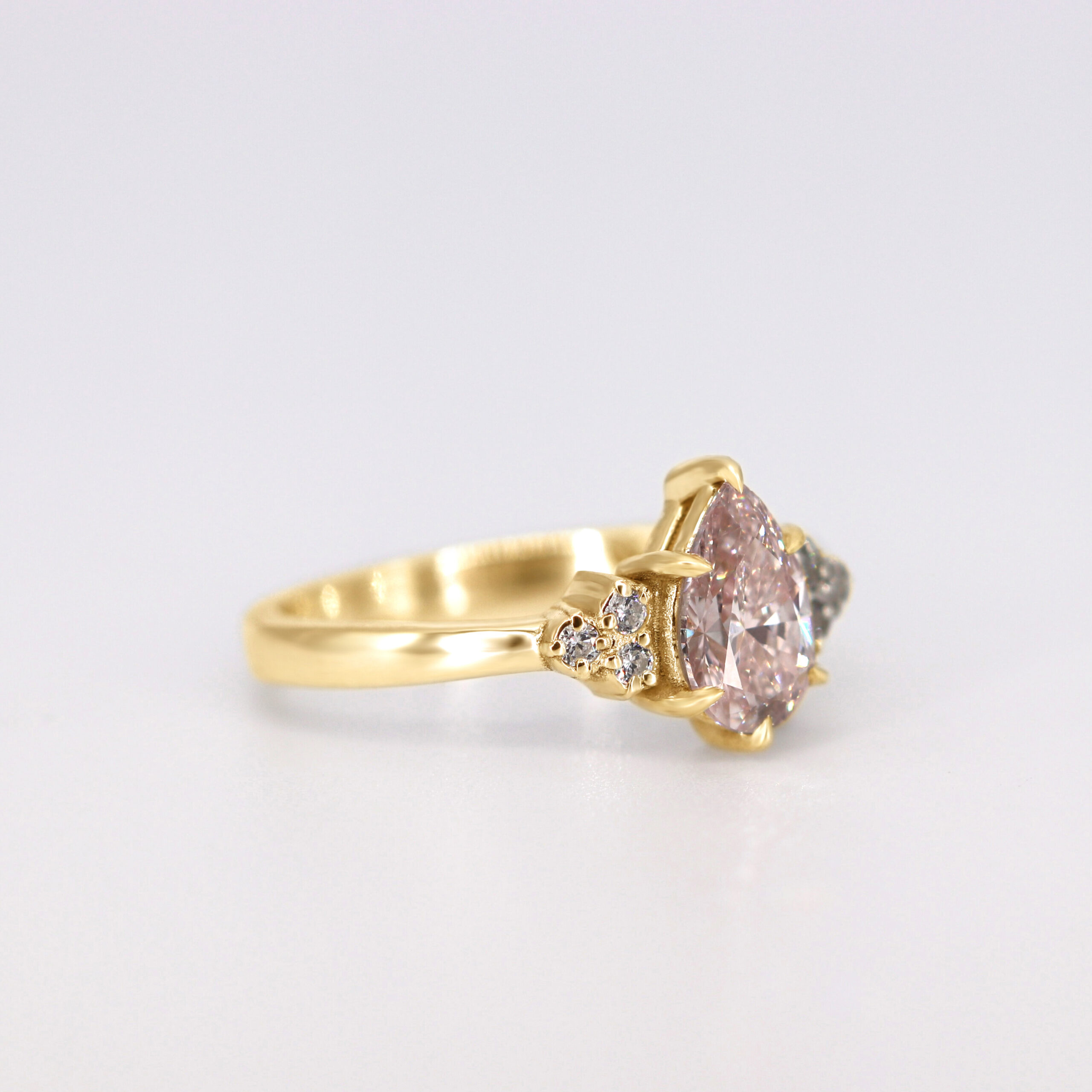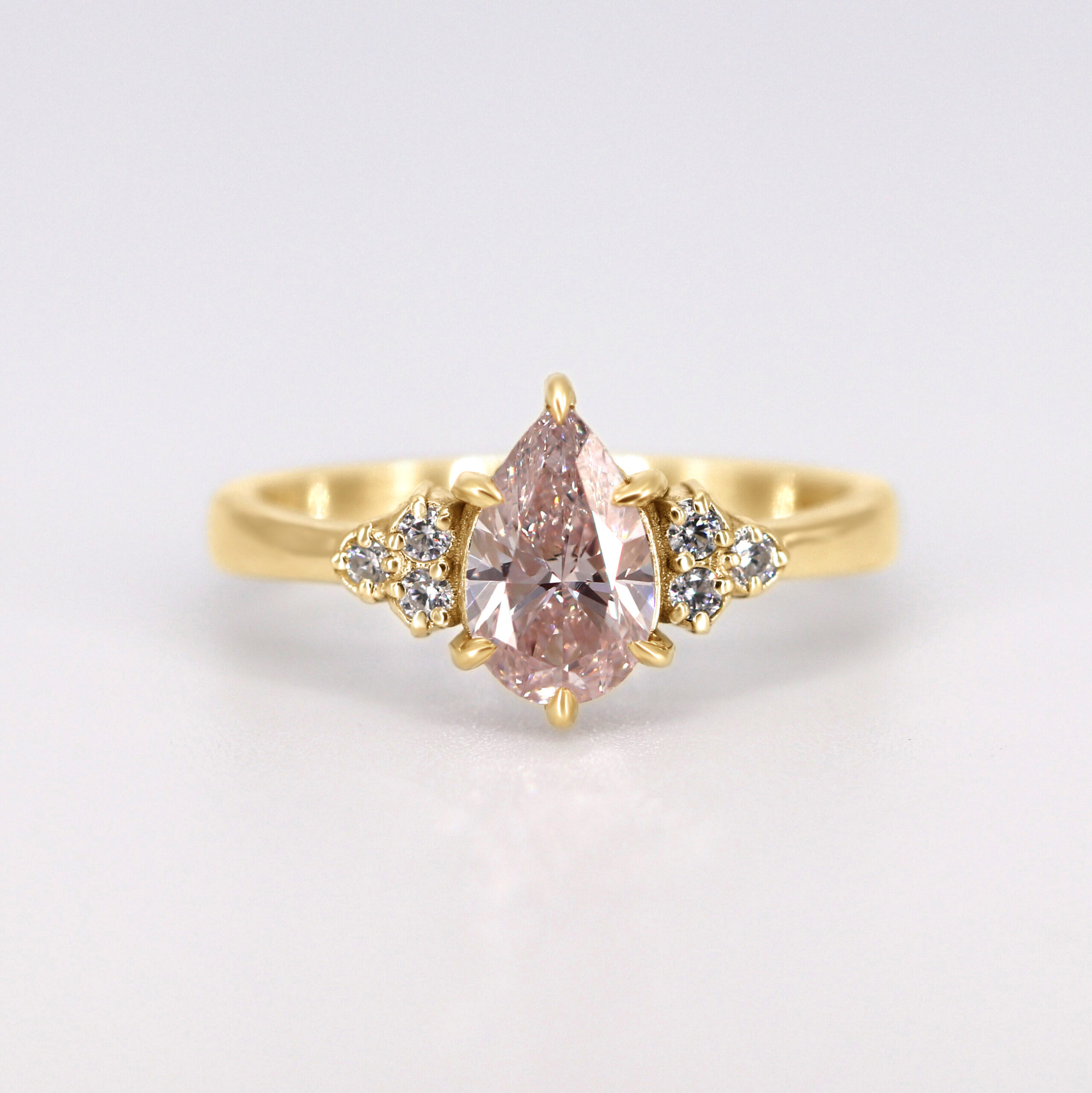 1 x 1ct pink pear shape diamond (lab grown) as center stone set in yellow gold,  and 6 x small white round lab grown diamonds as accent stones (H, VS total 0.1ct)