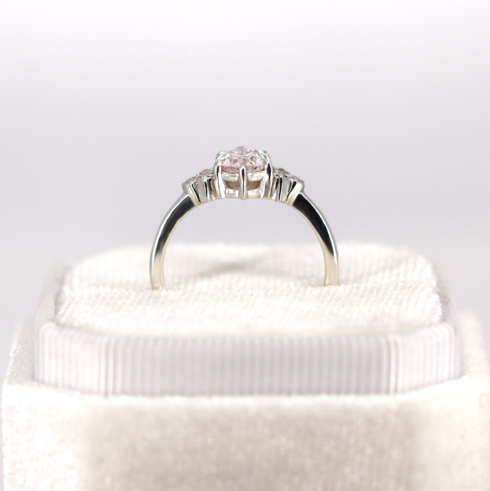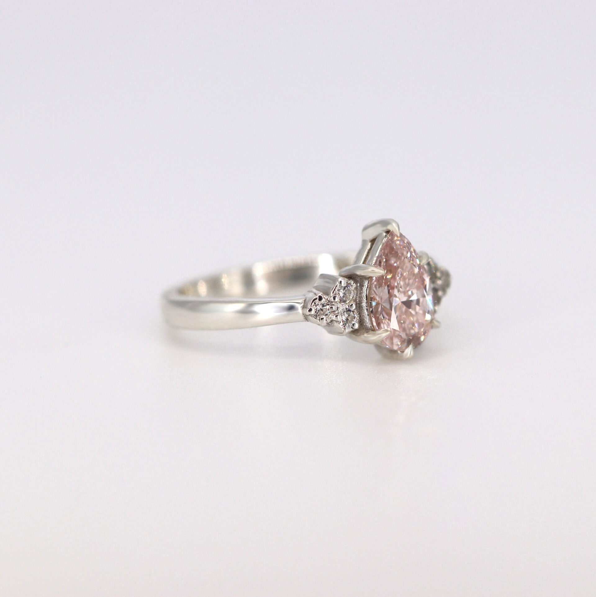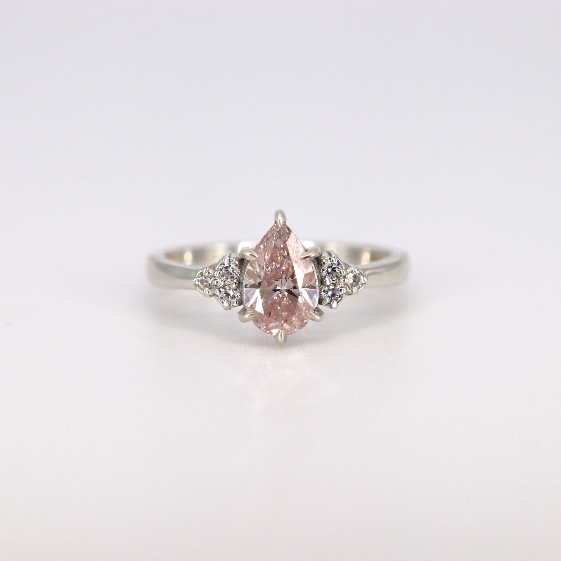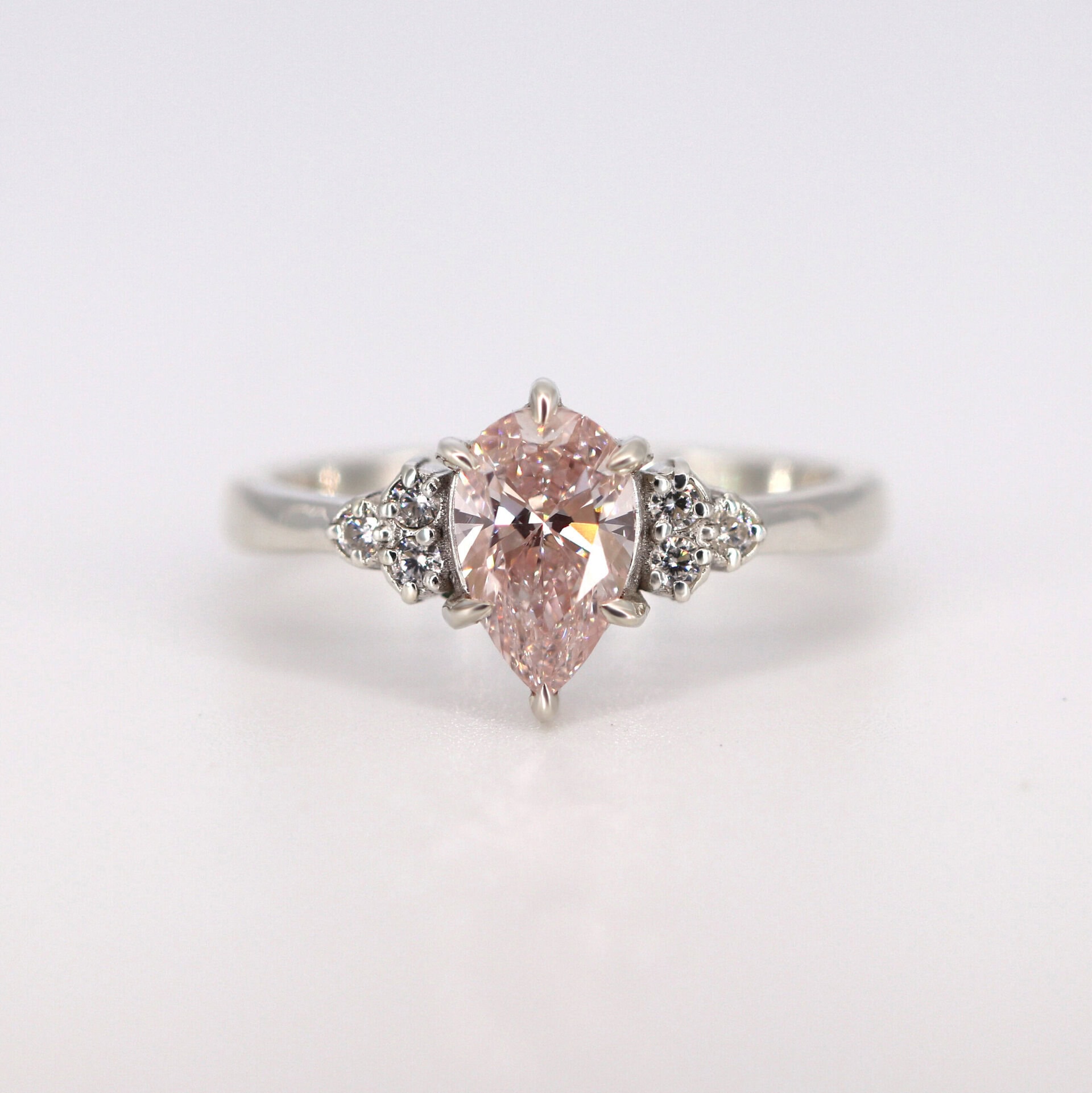 1 x 1ct pink pear shape diamond (lab grown) as center stone set in white gold,  and 6 x small white round lab grown diamonds as accent stones (H, VS total 0.1ct)