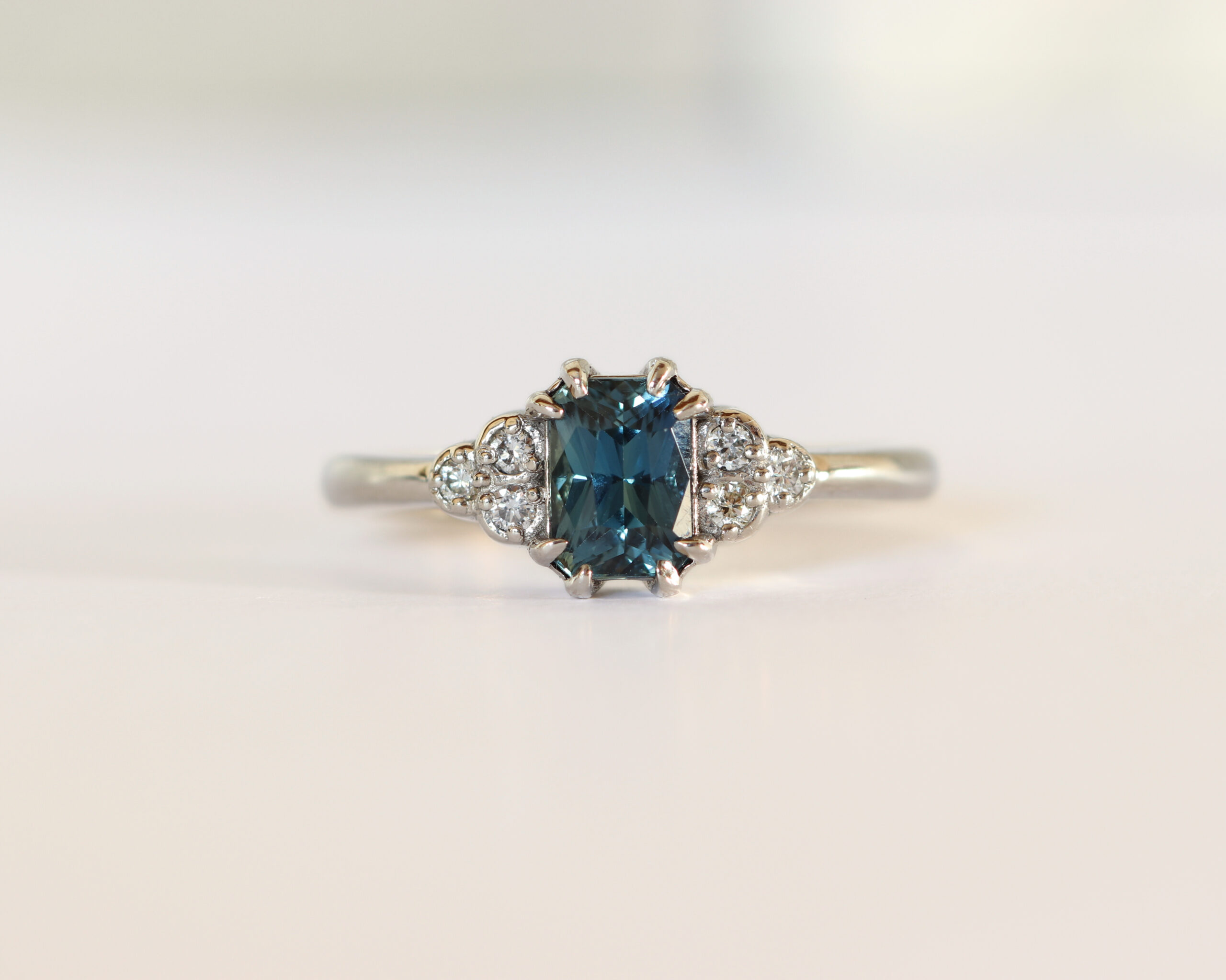 The center stone is a 1ct emerald cut natural teal sapphire (the one in the image is just an example, yours will be selected especially for you). The side stones are 6 x round brilliant white diamonds.