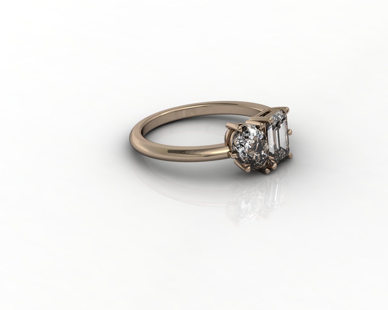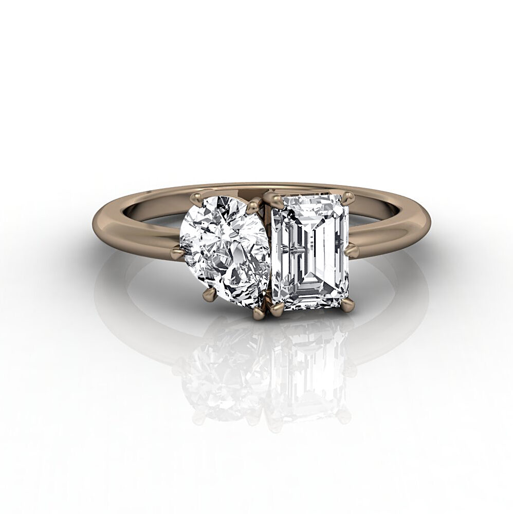 The ring contains one 0.8ct pear shape diamond and one 0.8ct emerald cut diamond in a Toi et Moi setting. Both diamonds are in claw settings with minimum specifications: H, VS